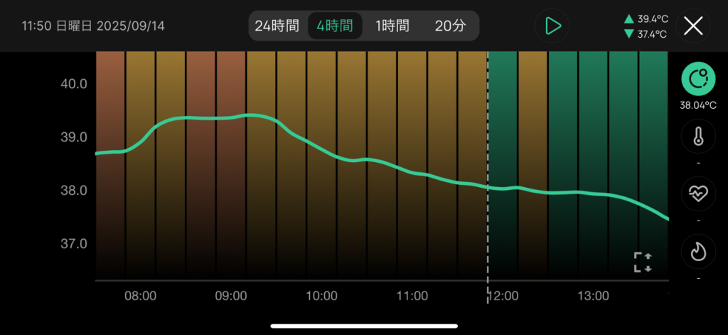 体調や疲労感は問題なく、設定ペースで進んでいたところ、気づけば深部体温が38.0度まで下がっていました。