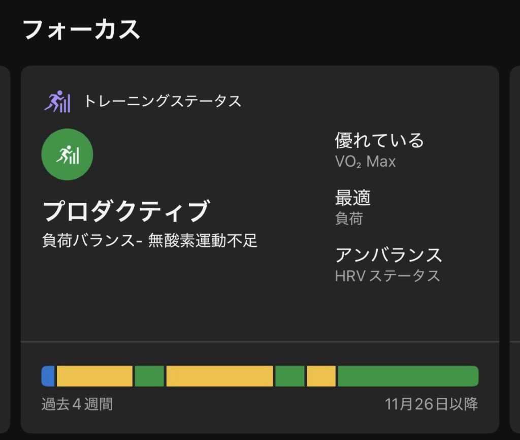 一方、トレーニングステータスはアンプロダクティブか疲れてますになるかと思いきや、プロダクティブ。