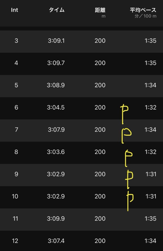 水曜ランの疲れで足が重くてキック打てず、沈んでタイムが出ず、、途中プルに逃げ…