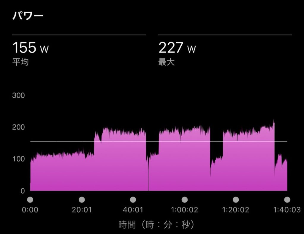 全然上げていけないのでアップを長めにして、FTP85%くらいのL3ゾーン(テンポ)20分×3インターバル(レスト5分)