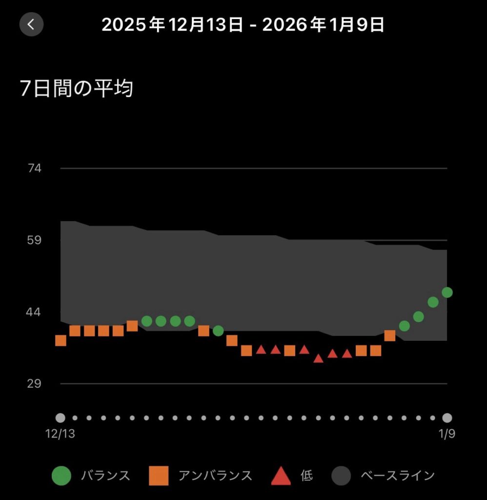 ガーミンで睡眠時に測定されるのですが、ずっとアンバランスで疲れた状態を示してましたが、正月休みで睡眠時間を多く取れたおかげか、正常になってきました。