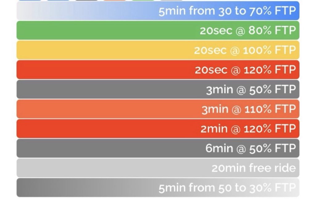 やり方はZwiftのメニューを自分で時間測定、パワー調整していくものです。