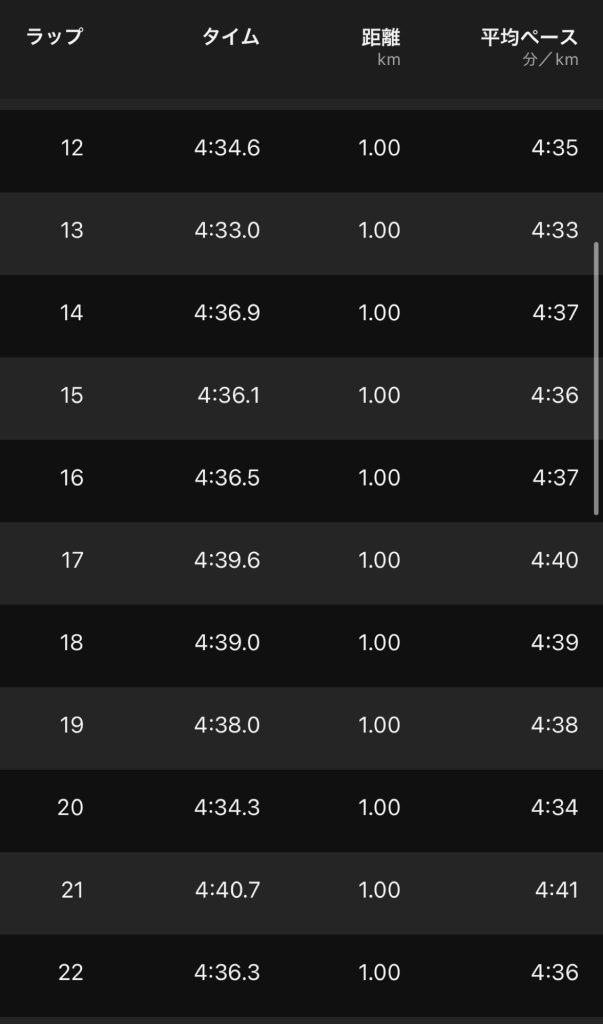 目標ペースは4’35〜37なので、これくらいでちょうどいいと思って走って行きました。