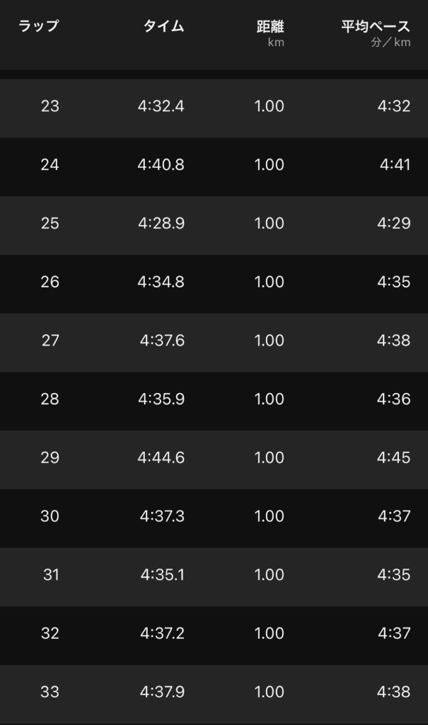 レースまでの走り込み、レースペースの抑えのおかげで、30km過ぎてもそれなりにペースを維持。