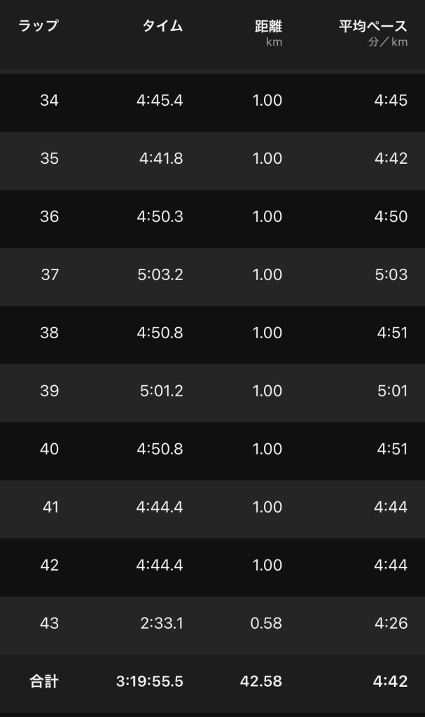 下関海響マラソンでは3時間45分だったので、そこから調整期間もいれて3ヶ月で積み上げられたなということろではありますが、まだまだ鍛え方が足りなかったようです。