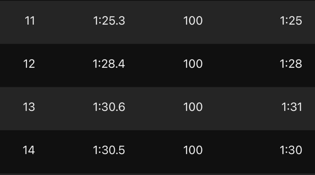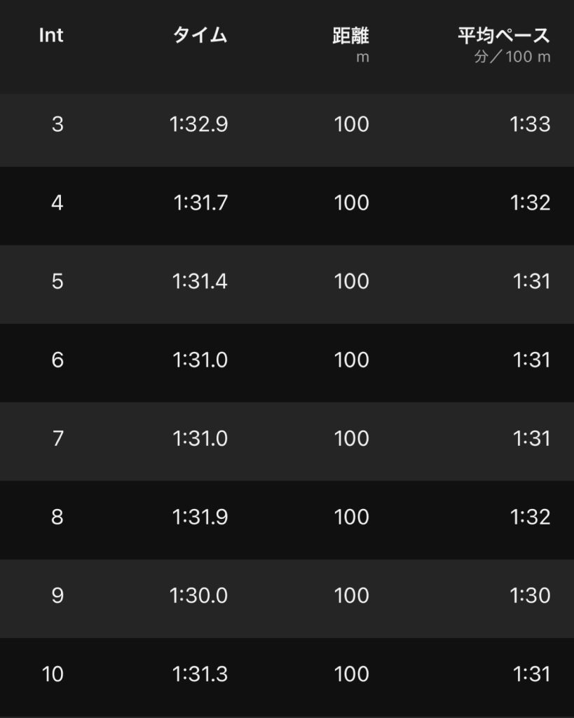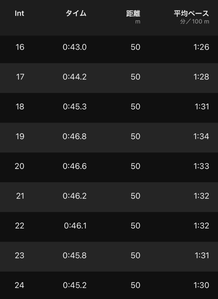 100mとしては1’40サークル、1’30〜1’32のペースで、これまでと同じはずなのに、キツい。