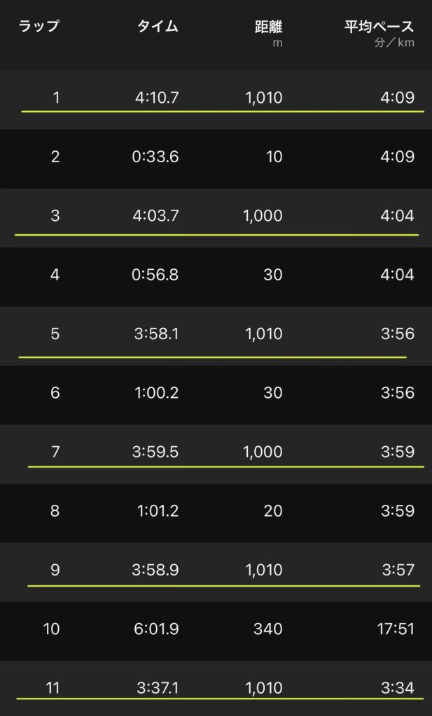 キロ4分で7本こなすより、スピード上限にチャレンジした方が鍛えられるかなと思い、5本終えたところで1本抜かして、ラスト全力!