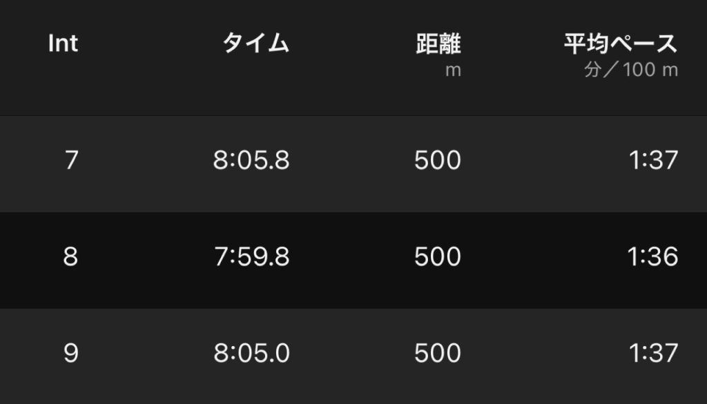 アップ後、メイン①は500m×3(9分サークル)と木曜日と同じ内容。